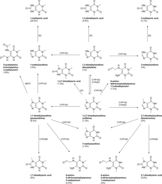 | Metabolites | • Paraxanthine 84% • Theobromine 12% • Theophylline 4% | ||