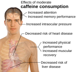 Caffeine is a central nervous system stimulant that may reduce fatigue and drowsiness.[10] At normal doses, caffeine has variable effects on learning and memory, but it generally improves reaction time, wakefulness, concentration, and motor coordination.[58][59] The amount of caffeine needed to produce these effects varies from person to person, depending on body size and degree of tolerance.[58] The desired effects arise approximately one hour after consumption, and the desired effects of a moderate dose usually subside after about three or four hours.[5]