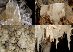 ![]() Clockwise from top left: scalenohedral, rhomboedral, stalactitic, and botryoidal calcite | |