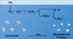 Climate change is exacerbating ocean acidification, possibly leading to lower natural calcite production. The oceans absorb large amounts of CO2 from fossil fuel emissions into the air.[58] The total amount of artificial CO2 absorbed by the oceans is calculated to be 118 ± 19 Gt C.[59] If a large amount of CO2 dissolves in the sea, it will cause the acidity of the seawater to increase, thereby affecting the pH value of the ocean.[58] Calcifying organisms in the sea, such as molluscs foraminifera, crustaceans, echinoderms and corals, are susceptible to pH changes.[58] Meanwhile, these calcifying organisms are also an essential source of calcite. As ocean acidification causes pH to drop, carbonate ion concentrations will decline, potentially reducing natural calcite production.[58]