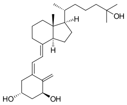 Calcitriol is a hormone and the active form of vitamin D, normally made in the kidney.[8][9][10] It is also known as 1,25-dihydroxycholecalciferol. It binds to and activates the vitamin D receptor in the nucleus of the cell, which then increases the expression of many genes.[11] Calcitriol increases blood calcium mainly by increasing the uptake of calcium from the intestines.[7]