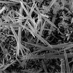 Electron micrograph of needle-like calcium carbonate crystals formed as limescale in a kettle