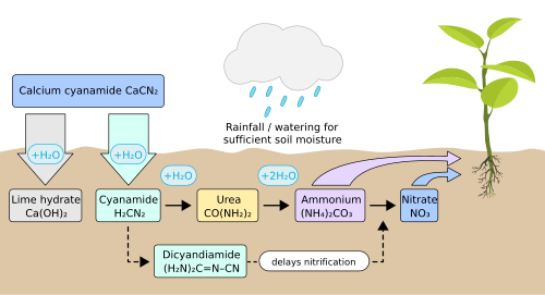 The main use of calcium cyanamide is in agriculture as a fertilizer.[3] In contact with water, it hydrolyses into hydrogen cyanamide which decomposes and liberates ammonia:[5]