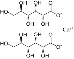 Calcium gluconate is the calcium salt of gluconic acid and is used as a mineral supplement and medication.[1] As a medication it is used by injection into a vein to treat low blood calcium, high blood potassium, and magnesium toxicity.[1][2] Supplementation is generally only required when there is not enough calcium in the diet.[3] Supplementation may be done to treat or prevent osteoporosis or rickets.[1] It can also be taken by mouth but is not recommended for injection into a muscle.[1]