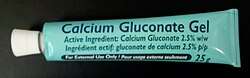 Gel preparations of calcium gluconate are used to treat hydrofluoric acid burns.[16][17] The calcium gluconate reacts with hydrofluoric acid to form insoluble, non-toxic calcium fluoride. In addition to a 2.5% calcium gluconate gel being applied directly to the chemical burn, the victim should be provided with oral or injected calcium supplementation because the fluoride ion (F−) precipitates serum calcium and can thus prompt hypocalcemia.[18]