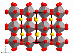 Calcium titanate is obtained as orthorhombic crystals, more specifically perovskite structure.[3] In this motif, the Ti(IV) centers are octahedral and the Ca2+ centers occupy a cage of 12 oxygen centers. Many useful materials adopt related structures, e.g. barium titanate or variations of the structure, e.g. yttrium barium copper oxide.