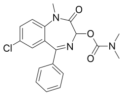 Camazepam[2] is a benzodiazepine psychoactive drug, marketed under the brand names Albego, Limpidon and Paxor. It is the dimethyl carbamate ester of temazepam, a metabolite of diazepam.[3] While it possesses anxiolytic, anticonvulsant, skeletal muscle relaxant and hypnotic properties[4] it differs from other benzodiazepines in that its anxiolytic properties are particularly prominent but has comparatively limited anticonvulsant, hypnotic and skeletal muscle relaxant properties.