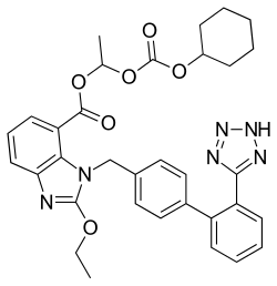 Candesartan is an angiotensin receptor blocker (ARB) primarily used to treat high blood pressure and congestive heart failure. It is always administered in its inactive prodrug form, candesartan cilexetil, which is converted to the active drug during absorption in the gastrointestinal tract. Like olmesartan, candesartan is a cascading prodrug, a feature that influences its pharmacokinetics. It has good bioavailability and is considered one of the most potent AT1 receptor antagonists by weight. Its effective maintenance dose is also relatively low.