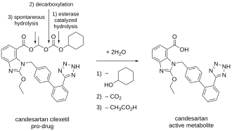 Candesartan is administered clinically as the cyclohexyl 1-hydroxy ethyl carbonate ester, known as candesartan cilexetil. It is a cascading prodrug that is completely metabolised by esterases in the intestinal wall during absorption, releasing the active candesartan moiety. In the first step of the activation process, the carbonate group is hydrolyzed, releasing carbon dioxide. This reaction also produces cyclohexanol, a relatively non-toxic byproduct that contributes to the favorable safety profile of the prodrug. Another side product of the cascading mechanism is acetic acid, derived from the hydrolysis of the O-CH(CH3)- group; like cyclohexanol, it is also non-toxic and poses minimal risk during drug activation.