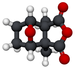 Cantharidin, from the Greek kantharis, for beetle,[4] is an odorless, colorless natural product with solubility in various organic solvents, but only slight solubility in water.[5] Its skeleton is tricyclic, formally, a tricyclo-[5.2.1.02,6]decane skeleton. Its functionalities include a carboxylic acid anhydride (−CO−O−CO−) substructure in one of its rings, as well as a bridging ether in its bicyclic ring system.