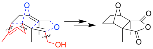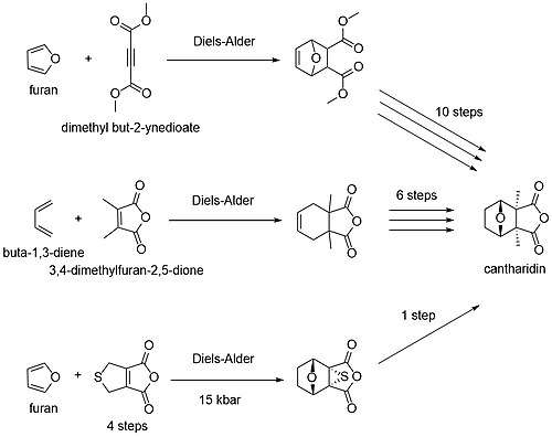 - ^ Dauben WG, Kessel CR, Takemura KH (15 October 1980). "Simple, efficient total synthesis of cantharidin via a high-pressure Diels-Alder reaction". Journal of the American Chemical Society. 102 (22): 6893–6894. Bibcode:1980JAChS.102.6893D. doi:10.1021/ja00542a060.