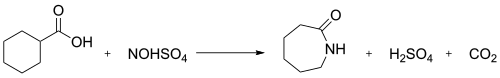 A minor industrial route involves the treatment of cyclohexanecarboxylic acid with nitrosylsulfuric acid (the Snia Viscosa process). This is thought to proceed via a ketene.