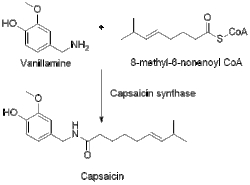 - ^ Fujiwake H, Suzuki T, Oka S, Iwai K (1980). "Enzymatic formation of capsaicinoid from vanillylamine and iso-type fatty acids by cell-free extracts of Capsicum annuum var. annuum cv. Karayatsubusa". Agricultural and Biological Chemistry. 44 (12): 2907–2912. doi:10.1271/bbb1961.44.2907.