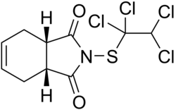 Captafol is a fungicide.[2] It is used to control almost all fungal diseases of plants except powdery mildews.[2] It is believed to be a human carcinogen, and production for use as a fungicide in the United States stopped in 1987. Its continued use from existing stocks was allowed, but in 1999 the Environmental Protection Agency banned its use on all crops except onions, potatoes, and tomatoes. In 2006 even these exceptions were disallowed, so currently its use on all crops is banned in the United States. Several other countries have followed suit since 2000, and as of 2010, no countries are known to allow the use of captafol on food crops.[3] Currently, the National Institute for Occupational Safety and Health established a recommended exposure limit of 0.1 mg/m3 for dermal exposures.[4]