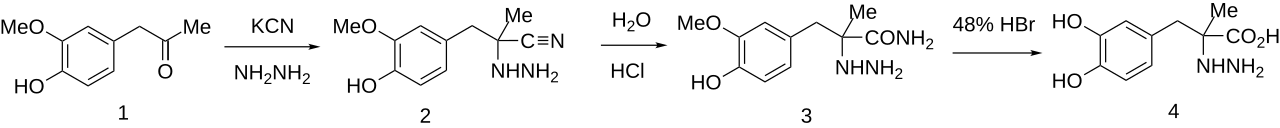- ^ Karady S, Ly MG, Pines SH, Sletzinger M (1971). "Synthesis of L-α-(3,4-dihydroxybenzyl)-α-hydrazinopropionic acid from optically active precursors by N-homologization". The Journal of Organic Chemistry. 36 (14): 1949–1951. doi:10.1021/jo00813a024.
