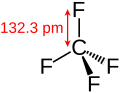 Because of the multiple carbon–fluorine bonds, and the high electronegativity of fluorine, the carbon in tetrafluoromethane has a significant positive partial charge which strengthens and shortens the four carbon–fluorine bonds by providing additional ionic character. Carbon–fluorine bonds are the strongest single bonds in organic chemistry.[6] Additionally, they strengthen as more carbon–fluorine bonds are added to the same carbon atom. In the one-carbon organofluorine compounds represented by molecules of fluoromethane, difluoromethane, trifluoromethane, and tetrafluoromethane, the carbon–fluorine bonds are strongest in tetrafluoromethane.[7] This effect is due to the increased coulombic attractions between the fluorine atoms and the carbon because the carbon has a positive partial charge of 0.76.[7]