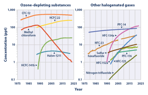 1. ^ This figure is for all perfluorocarbons: no data for the preindustrial abundance of individual compounds of this class exist.