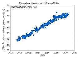 Tetrafluoromethane is the most abundant perfluorocarbon in the atmosphere, where it is designated as PFC-14. Its atmospheric concentration is growing:[12] its preindustrial concentration produced via radioactive oxidation of fluorite and reaction with organic molecules was less than 40 parts per trillion.[13][a] As of 2019, the man-made gases CFC-11 and CFC-12 continue to contribute a stronger radiative forcing than PFC-14.[14]