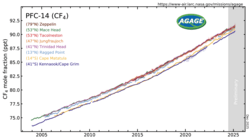 PFC-14 measured by the Advanced Global Atmospheric Gases Experiment (AGAGE) in the lower atmosphere (troposphere) at stations around the world. Abundances are given as pollution free monthly mean mole fractions in parts-per-trillion.