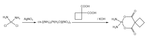 Cisplatin reacts with silver nitrate and then cyclobutane-1,1-dicarboxylic acid to form carboplatin.[21]