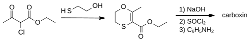 Ethyl 2-chloroacetoacetate is treated with 2-mercaptoethanol and base, followed by cyclisation and water removal under acidic conditions. The resultant ethyl ester of the 1,4-oxathiine heterocycle is then formed into an amide with aniline using standard conditions via the carboxylic acid and acid chloride. This gives carboxin in high overall yield.[5] The compound has been crystallised in two polymorphic forms,[6] which have equal biological activity.[7]