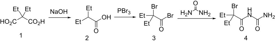 Diethylmalonic acid [510-20-3] (1 ) is decarboxylated to 2-ethylvaleric acid [20225-24-5] (2 ). The Hell-Volhard-Zelinsky reaction converts this to 2-bromo-2-ethylbutyryl bromide [26074-53-3] (3 ). Reaction with urea with affords carbromal (4 ).