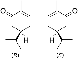 Carvone has two mirror image forms, or enantiomers: R-(−)-carvone, the sweetish minty smell of spearmint leaves. Its mirror image, S-(+)-carvone, has a spicy aroma with notes of rye, and gives caraway seeds their smell.[5][6]