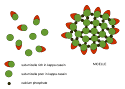 - ^ Panouillé M, Durand D, Nicolai T, Larquet E, Boisset N (July 2005). "Aggregation and gelation of micellar casein particles". Journal of Colloid and Interface Science. 287 (1): 85–93. Bibcode:2005JCIS..287...85P. doi:10.1016/j.jcis.2005.02.008. PMID 15914152.