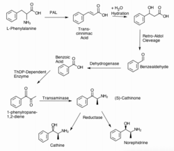 The synthesis of cathinone in khat begins with L-phenylalanine and the first step is carried out by L-phenylalanine ammonia lyase (PAL), which cleaves off an ammonia group and creates a carbon-carbon double bond, forming cinnamic acid.[43] After this, the molecule can either go through a beta-oxidative pathway or a non-beta-oxidative pathway. The beta-oxidative pathway produces benzoyl-CoA while the non-beta-oxidative pathway produces benzoic acid.[43] Both of these molecules can be converted to 1-phenylpropane-1,2-dione by a condensation reaction catalyzed by a ThDP-dependent enzyme (Thiamine diphosphate-dependent enzyme) with pyruvate and producing CO2.[43] 1-phenylpropane-1,2-dione goes through a transaminase reaction to replace a ketone with an ammonia group to form (S)-cathinone. (S)-Cathinone can then undergo a reduction reaction to produce the less potent but structurally similar cathine or norephedrine, which are also found in the plant.[43]