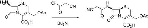 It was made by reacting 7-ACA (7-aminocephalosporanic acid) with cyanoacetyl chloride in the presence of tributylamine.