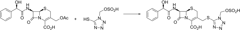 Cefonicid is synthesized conveniently by nucleophilic displacement of the 3-acetoxy moiety of 1 with the appropriately substituted tetrazole thiole 2 . The mandelic acid amide C-7 side chain is reminiscent of cefamandole .