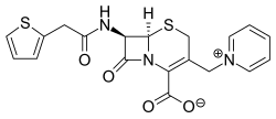 Cephaloridine is a cephalosporin compound with pyridinium-1-ylmethyl and 2-thienylacetamido side groups. The molecular nucleus, of which all cephalosporins are derivatives, is A3-7-aminocephalosporanic acid. Conformations around the β-lactam rings are quite similar to the molecular nucleus of penicillin, while those at the carboxyl group exocyclic to the dihydrothiazine and thiazolidine rings respectively are different.[4]