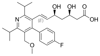 Cerivastatin consists of a fluorophenyl linked to a pyridine. The pyridine has two isopropyl groups, one methoxy group and a dihydroxyheptanoic acid side chain. The dihydroxyheptanoic acid group is the functional part of the molecule. This part will bind to the HMG-CoA reductase making it unavailable for HMG-CoA.[6] Cerivastatin is a pure synthetic drug, produced to create a more potent inhibitor of HMG-CoA reductase. Cerivastatin was the most potent inhibitor with an inhibitory constant of 0.5 μg/L, which made it already effective at a low dose. It is taken up orally as tablets, where it is combined with sodium salt. The IUPAC name is then (+)-(3R,5S,6E)-7-[4-(4-fluorophenyl)-2,6-diisopropyl-5-methoxymethylpyridin-3-yl]-3,5-dihydroxy-6-heptenoic acid monosodium salt.[7] Cerivastatin sodium (C22H33FNO3Na) is administered orally via a tablet. The molecular weight is 481.5 g/mol.[6] It is odorless and it is soluble in water, methanol and ethanol. Under acidic circumstances, it undergoes cyclization to form pyridinolactone.[7]