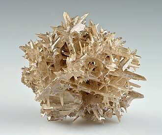 Cerussite crystallizes in the orthorhombic crystal system and is isomorphous with aragonite. Like aragonite it is very frequently twinned, the compound crystals being pseudo-hexagonal in form. Three crystals are usually twinned together on two faces of the prism, producing six-rayed stellate groups with the individual crystals intercrossing at angles of nearly 60°. Crystals are of frequent occurrence and they usually have very bright and smooth faces. The mineral also occurs in compact granular masses, and sometimes in fibrous forms. The mineral is usually colorless or white, sometimes grey or greenish in tint and varies from transparent to translucent with an adamantine lustre. It is very brittle, and has a conchoidal fracture. It has a Mohs hardness of 3 to 3.75 and a specific gravity of 6.5. A variety containing 7% of zinc carbonate, replacing lead carbonate, is known as iglesiasite, from Iglesias in Sardinia, where it is found.[5]