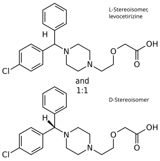 Cetirizine contains L- and D-stereoisomers. Chemically, levocetirizine is the active L-enantiomer of cetirizine. The drug is a member of the diphenylmethylpiperazine group of antihistamines. Analogues include cyclizine and hydroxyzine.[47]