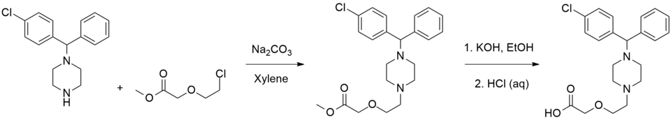 The 1-(4-chlorophenylmethyl)-piperazine is alkylated with methyl (2-chloroethoxy)-acetate in the presence of sodium carbonate and xylene solvent to produce the Sn2 substitution product in 28% yield. Saponification of the acetate ester is done by refluxing with potassium hydroxide in absolute ethanol to afford a 56% yield of the potassium salt intermediate. This is then hydrolyzed with aqueous HCl and extracted to give an 81% yield of the carboxylic acid product.[48]