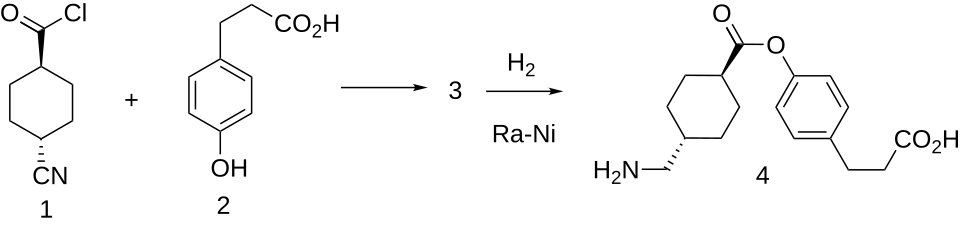 Cetraxate is a prodrug of tranexamic acid. The latter is a hemostatic agent because it inhibits the activation of plasminogen to plasmin. The result is to prevent excess loss of blood in gastrointestinal ulcers. The synthesis begins with the esterification of 3-(p-hydroxyphenyl)propionic acid (2) by trans-4-cyanocyclohexanecarbonyl chloride (1). The product (3) is reduced to cetraxate (4) by catalytic hydrogenation with hydrogen and Raney nickel.[3][4]