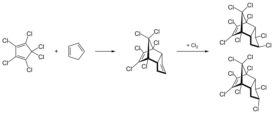 Hexachlorocyclopentadiene forms a Diels-Alder adduct with cyclopentadiene to give chlordene intermediate [3734-48-3]; chlorination of this adduct gives predominantly two chlordane isomers, α and β, in addition to other products such as trans-nonachlor and heptachlor.[7] The β-isomer is popularly known as gamma and is more bioactive.[5] The mixture that is composed of 147 components is called technical chlordane.[8][9]