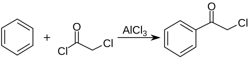 Phenacyl chloride is readily available and was first prepared by chlorination of acetophenone vapour.[7] It may also be synthesized by the Friedel-Crafts acylation of benzene using chloroacetyl chloride, with an aluminium chloride catalyst:[8]