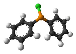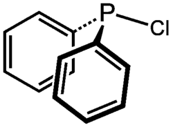Chlorodiphenylphosphine is an organophosphorus compound with the formula (C6H5)2PCl, abbreviated Ph2PCl. It is a colourless oily liquid with a pungent odor that is often described as being garlic-like and detectable even in the ppb range. It is useful reagent for introducing the Ph2P group into molecules, which includes many ligands.[2] Like other halophosphines, Ph2PCl is reactive with many nucleophiles such as water and easily oxidized even by air.