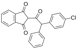 Chlorophacinone is an organic compound with the following systematic name: (2-[2-(4-chlorophenyl)-2-phenylacetyl]indan-1,3-dione. The structure consists of an acetyl group, connected on one side to indanedione ring. Two phenyl groups are attached to the other side, one contains a chloride. Chlorophacinone contains one optically active carbon and therefore it occurs as two enantiomers.