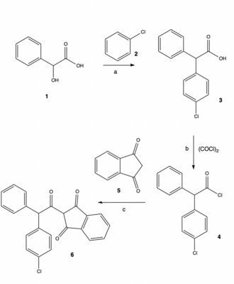 The synthesis uses mandelic acid 1 as starting product as it is a cheap and commercially available. Mandelic acid reacts with chlorobenzene 2 in presence of SnCl4 to afford 85% of the phenylacetic acid 3. Thereafter, the phenylacetic acid is treated with oxalyl chloride at room temperature to obtain 6-chloro-2,2-diphenylacetyl chloride 4. No purification is needed to start the last step of the synthesis, which is a Friedel-Crafts reaction of the previously obtained compound 4 with 1,3- indanedione 5. This reaction provided the final product, chlorophacinone 6, with no significant amount of diphacinone or other side products.[9]