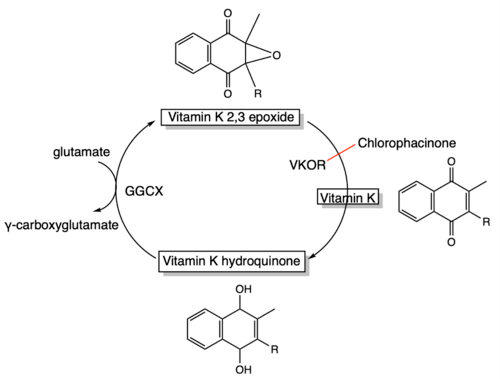 Chlorophacinone is a first-generation anticoagulant rodenticide. The compound is an indandione derivate. It acts as a vitamin K antagonist and exerts its anticoagulatory effect by interfering with the hepatic synthesis of vitamin K-dependent clotting factors.[5] Synthesis of clotting factor II, VII, IX and X involves the posttranslational carboxylation of glutamate to γ-carboxyglutamate by the enzyme γ-glutamyl carboxylase (GGCX). The γ-carboxyglutamate residues promote the binding of clotting factors to phospholipids of the blood vessels, thereby accelerating coagulation. However, a vitamin K hydroquinone (KH2) cofactor is needed for the carboxylation reaction to occur. The KH2 is converted to vitamin K 2,3 epoxide (KO) during the carboxylation reaction. The KH2 cofactor is created within the vitamin K redox cycle. Chlorophacinone interferes with the vitamin K redox cycle by inhibiting vitamin K epoxide reductase (VKOR), an integral membrane protein present in the endoplasmic reticulum (ER). The enzyme plays a vital role within this cycle. The catalytic activity of VKOR is required for the reduction of KO to vitamin K to KH2. The inhibition of VKOR by chlorophacinone prevents the recycling of vitamin K from KO to KH2 (figure 2). Therefore, the supply of KH2 in the tissue will diminish, this in turn will decrease the carboxylation activity of γ-glutamyl carboxylase.[10][11] Resulting in under-carboxylation of clotting factors, meaning they are no longer capable of binding to the endothelial surface of blood vessels, and thus are biologically inactive.[12]