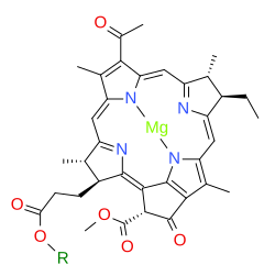 Bacteriochlorophylls are the light harvesting pigments found in photosynthetic bacteria: they do not produce oxygen as a side-product. There are many such structures but all are biosynthetically related by being derived from chlorophyllide a.[1][16]