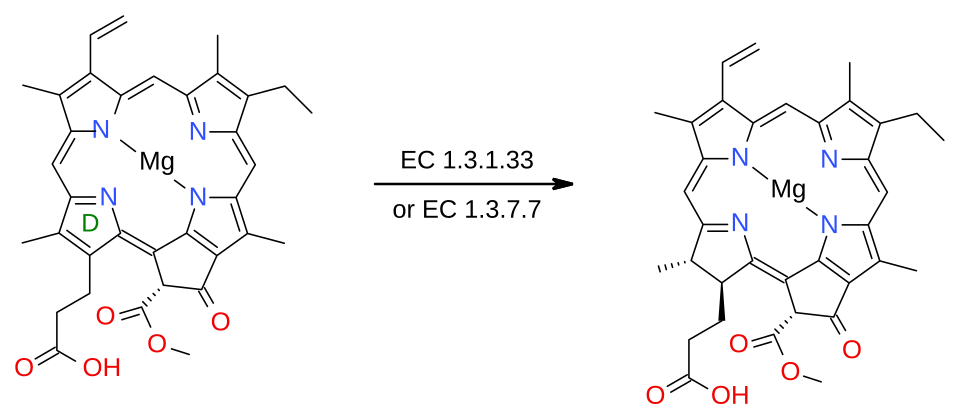 This is followed by the reaction EC 1.3.1.33 in which the pyrrole ring D is reduced by the enzyme protochlorophyllide reductase[11]