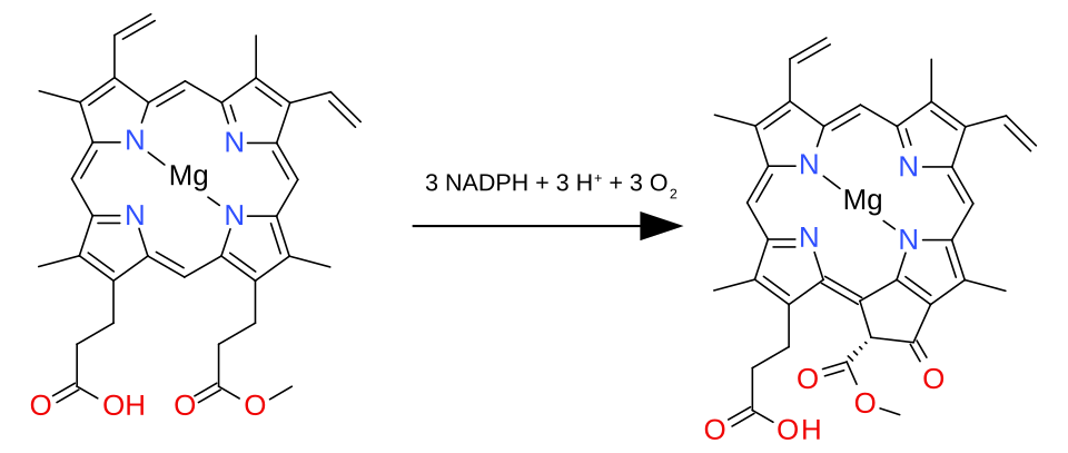 The chlorin ring system features a five-membered carbon ring E is created when one of the propionate groups of the porphyrin is cyclised to the carbon atom linking the original pyrrole rings C and D. A series of chemical steps catalysed by the enzyme Magnesium-protoporphyrin IX monomethyl ester (oxidative) cyclase[7] gives the overall reaction EC 1.14.13.81