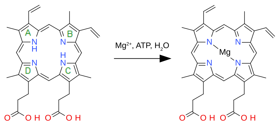 Chlorophyll is characterised by having a magnesium ion coordinated within a ligand called a chlorin. The metal is inserted into protoporphyrin IX by the enzyme magnesium chelatase[1] which catalyzes the reaction EC 6.6.1.1