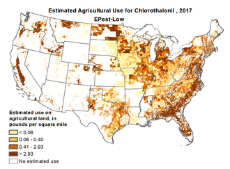 Chlorothalonil (2,4,5,6-tetrachloroisophthalonitrile) is an organic compound mainly used as a broad spectrum, nonsystemic fungicide, with other uses as a wood protectant, pesticide, acaricide, and to control mold, mildew, bacteria, algae.[2] Chlorothalonil-containing products are sold under the names Bravo, Echo, and Daconil. It was first registered for use in the US in 1966. In 1997, it was the third most used fungicide in the US, behind only sulfur and copper, with 12 million pounds (5.4 million kilograms) used in agriculture that year.[3] Including nonagricultural uses, the United States Environmental Protection Agency (EPA) estimates, on average, almost 15 million lb (6.8 million kg) were used annually from 1990 to 1996.[2]