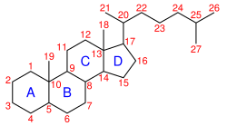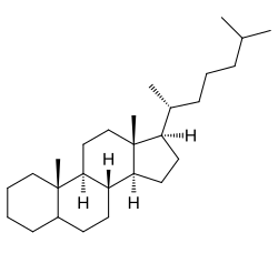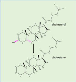 Cholestane is a saturated tetracyclic steroid biosynthetically derived from triterpenoids. This 27-carbon biomarker is produced by diagenesis of cholesterol and is one of the most abundant biomarkers in the rock record.[2] Presence of cholestane, its derivatives and related chemical compounds in environmental samples is commonly interpreted as an indicator of animal life and/or traces of O2, as animals are known for exclusively producing cholesterol, and thus has been used to draw evolutionary relationships between ancient organisms of unknown phylogenetic origin and modern metazoan taxa.[3] Cholesterol is made in low abundance by other organisms (e.g., rhodophytes, land plants), but because these other organisms produce a variety of sterols it cannot be used as a conclusive indicator of any one taxon.[4][5] It is often found in analysis of organic compounds in petroleum.
