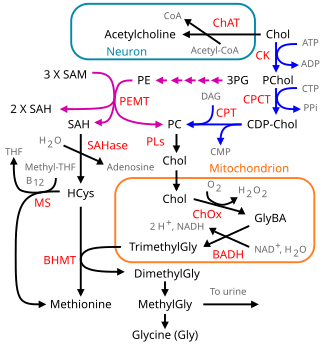 Choline is required to produce acetylcholine – a neurotransmitter – and S-adenosylmethionine (SAM), a universal methyl donor. Upon methylation SAM is transformed into S-adenosyl homocysteine.[2]